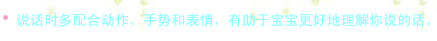 雖然大部分 1 歲左右的寶寶還不會(huì)說(shuō)話,或者只能說(shuō)很少的話,但是他們可以用手勢(shì)跟別人交流,你要多鼓勵(lì)他,當(dāng)然也要仔細(xì)觀察,及時(shí)替他表達(dá),翻譯他的手勢(shì)。